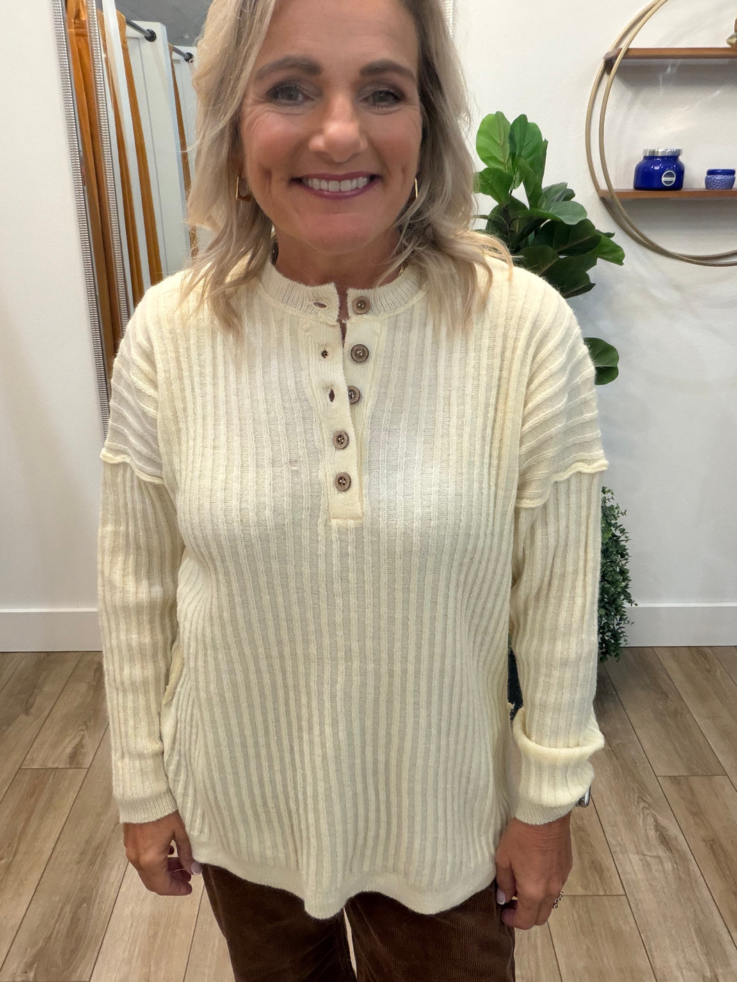 Stay cozy and chic in our Long Sleeve Round Neck Half Button-Down Oversized Henley Ribbed Sweater. This oversized henley combines relaxed style with thoughtful detailing: a round neckline and half-button front add a touch of casual charm, while ribbed texture brings a flattering, stretchy fit.