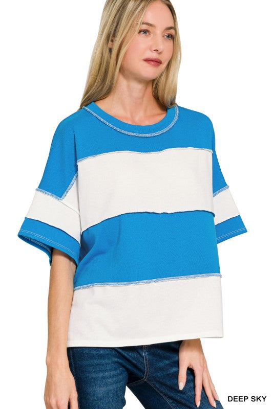 This French terry color block top brings playful style to your everyday wardrobe. The exposed seam details add an unexpected design twist that catches the eye, while the soft, breathable fabric keeps you comfortable all day long. Perfect for casual outings or relaxed weekends, this versatile piece pairs beautifully with your favorite jeans or joggers. A modern essential that feels as good as it looks!
