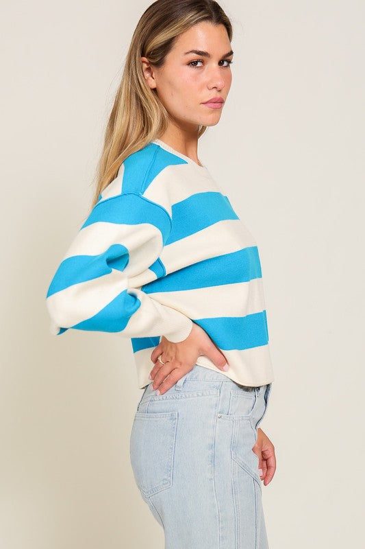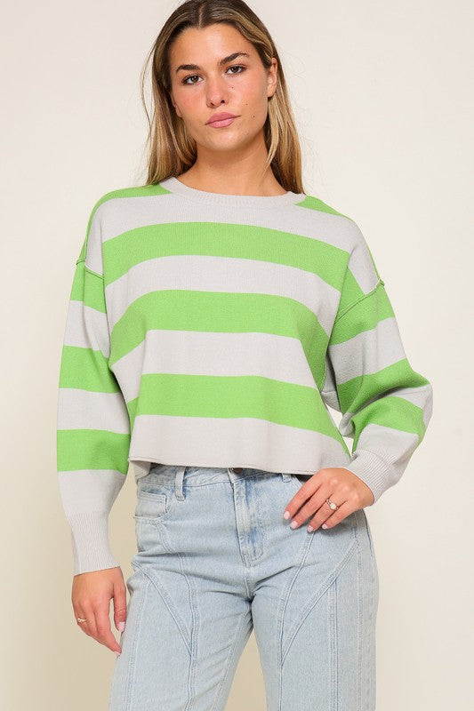 Introducing our Bold Stripe Relaxed Fit Pullover Sweater, a stylish and cozy addition to your wardrobe. This sweater features a bold and eye-catching stripe pattern that adds a pop of color and excitement to any outfit. The crop length design gives it a modern and trendy look, perfect for pairing with high-waisted jeans or shorts.