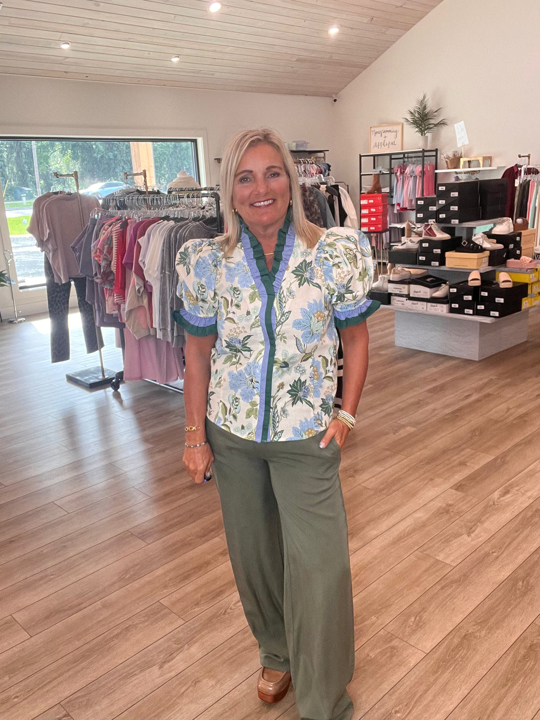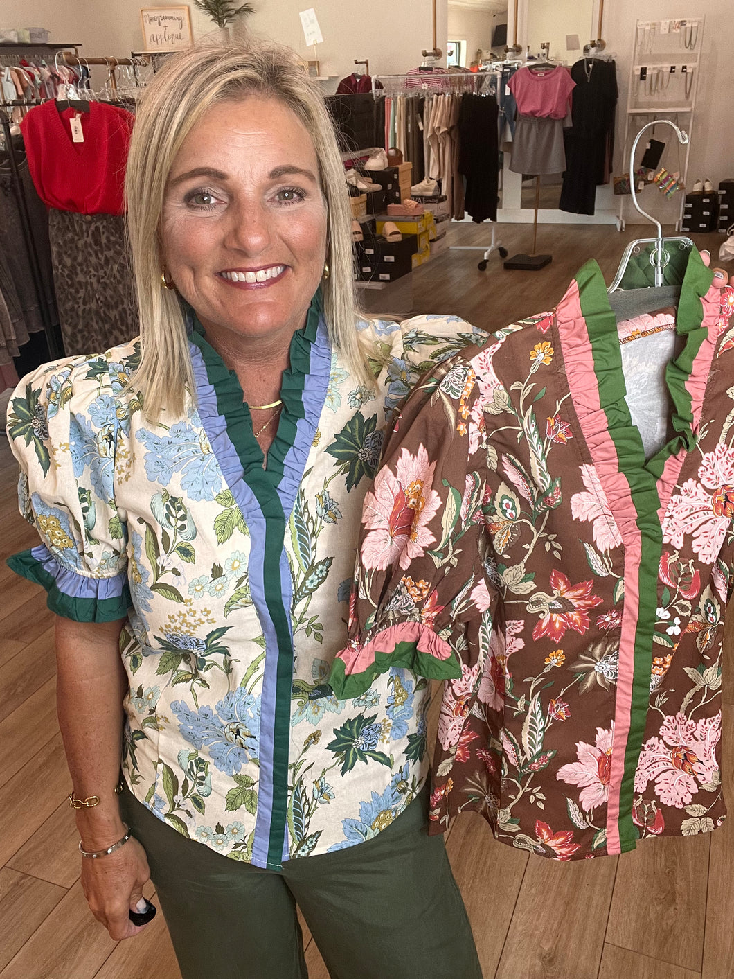 This charming floral print top features delicate shoulder puff sleeves and a multicolor accent ruffle band, adding a playful and feminine touch to your wardrobe. Perfect for brightening any outfit with its soft, pretty details.