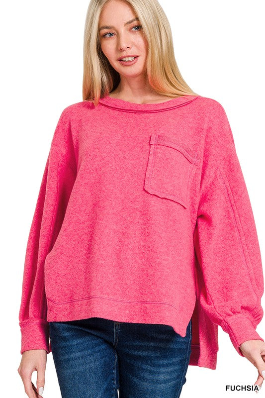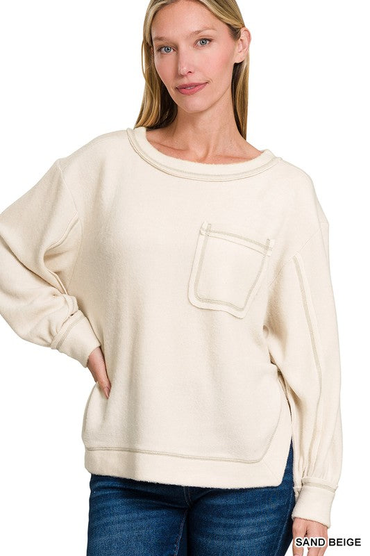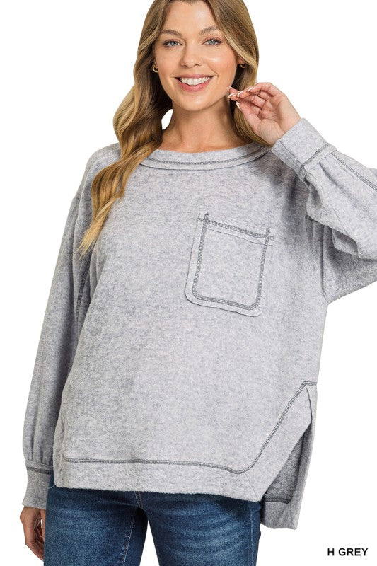 Experience cozy comfort with this brushed hacci sweater featuring a relaxed round neck and a stylish hi-low hem. Side slits add ease of movement and a casual flair, making it perfect for everyday wear. Soft and breathable, it’s your go-to piece for laid-back days with a touch of effortless style.