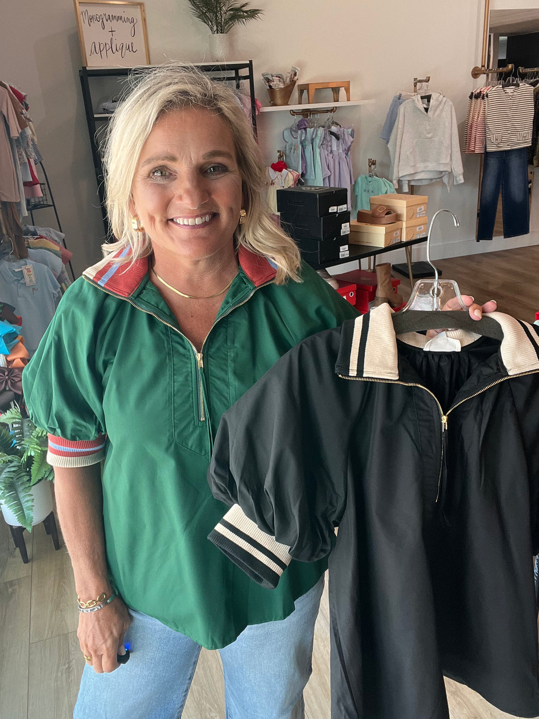 Solid zip-front closure elbow-length sleeve top featuring multicolor accent band. Unlined. Woven.