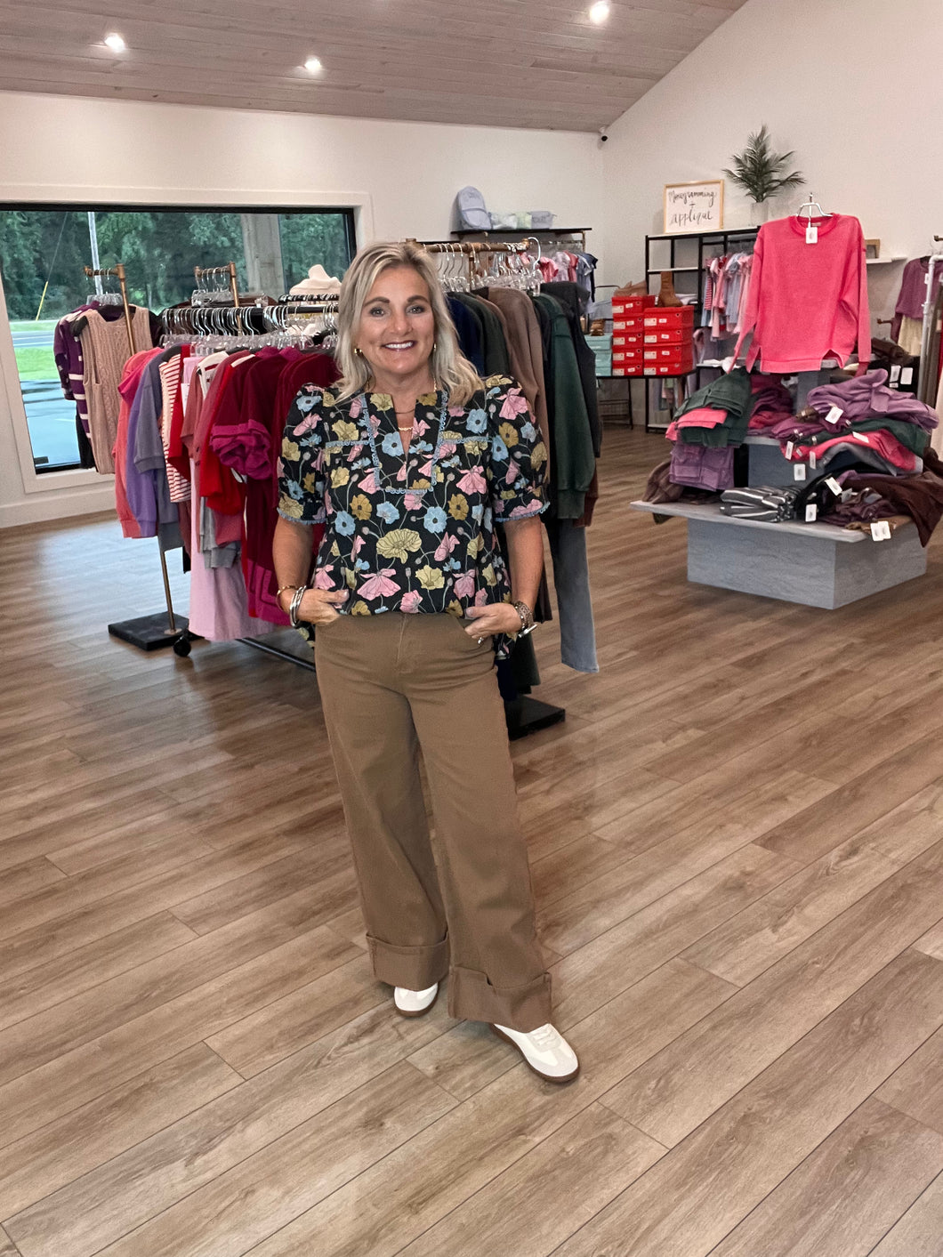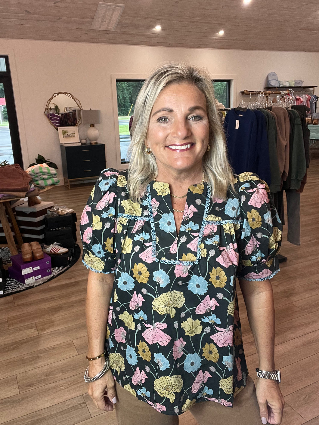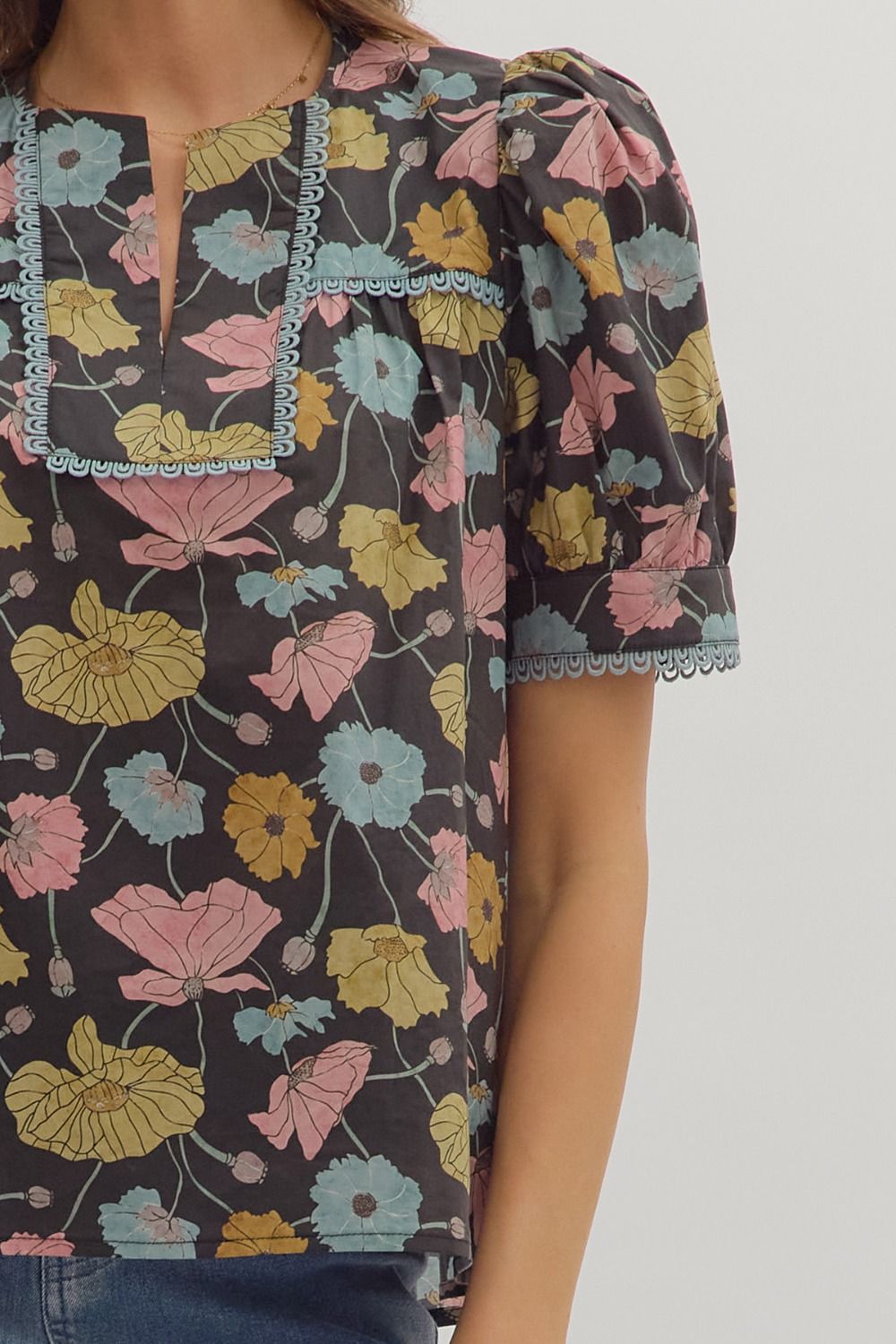 Botanical print short puff sleeve top featuring scallop accent trim and V-neck. Unlined. Woven.