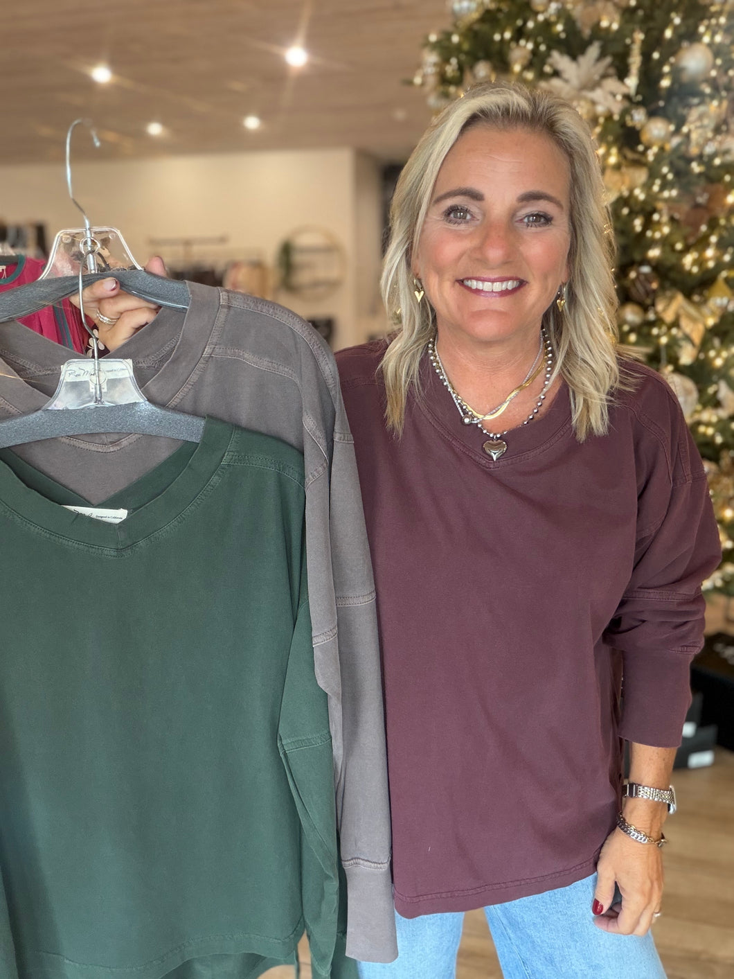 Soft, breathable, and quietly detailed-this pigment-washed V-neck top brings ease and edge together. It's relaxed but never ordinary. The kind of piece that slips on and instantly elevates your everyday.