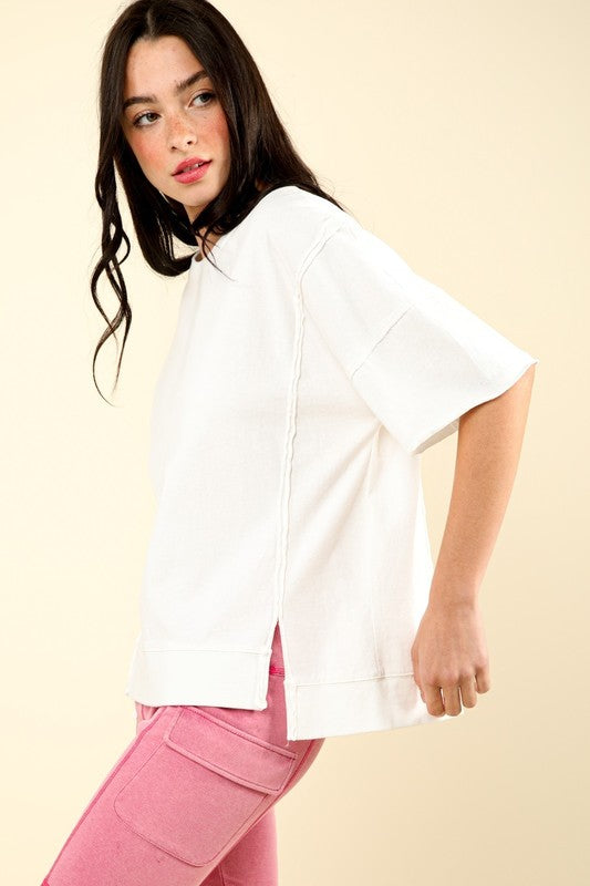 Upgrade your wardrobe with our trendy mineral wash top! Featuring exposed seams and a split detail on the hemline, this top adds a touch of edginess to any outfit. The perfect combination of style and comfort.