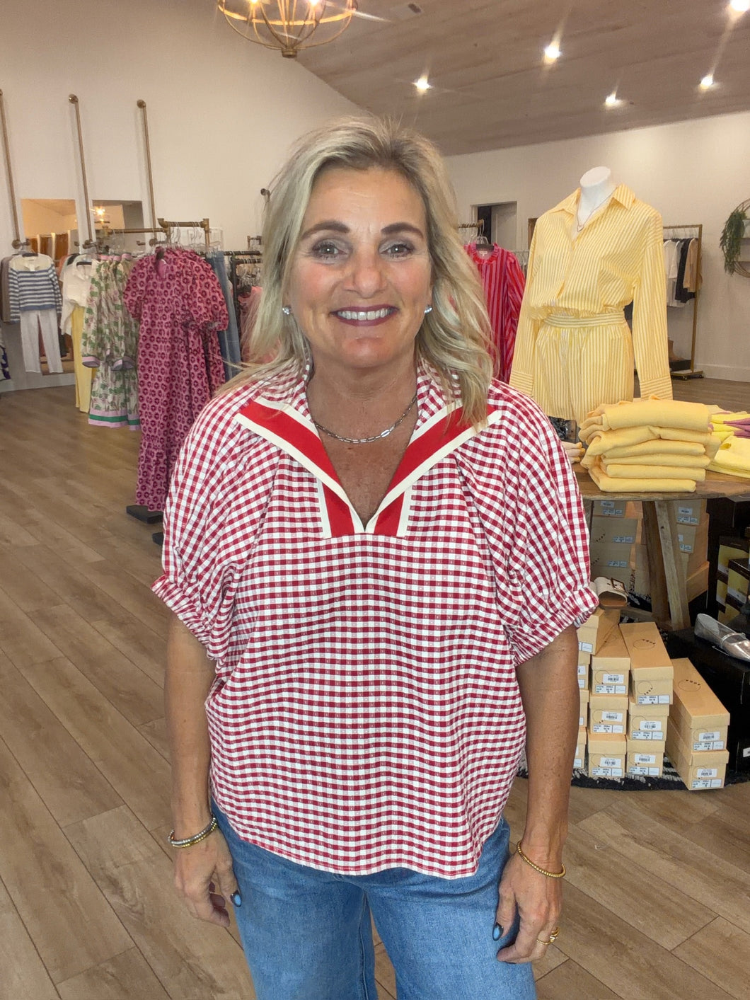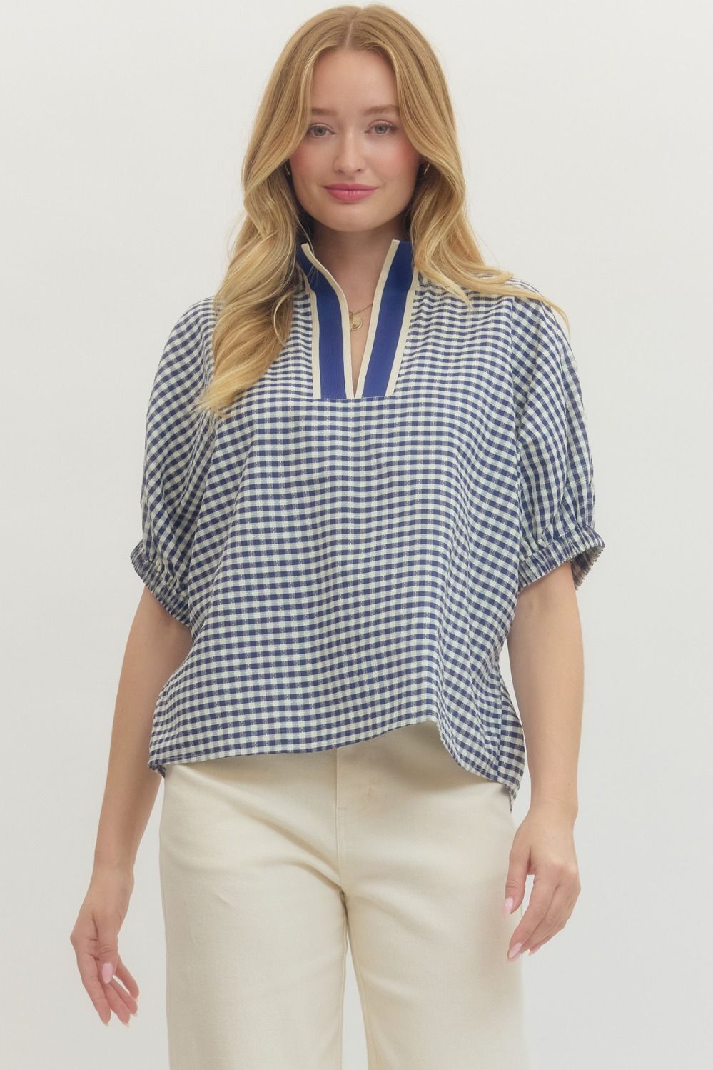 Effortless style meets comfort in this charming gingham top. The relaxed dolman sleeves provide an easy, breezy fit perfect for casual days, while the contrast trim V-neck adds a polished touch. Whether you're dressing it up with tailored pants or keeping it laid-back with denim, this versatile piece transitions seamlessly from weekend errands to coffee dates. A wardrobe essential that feels as good as it looks.
