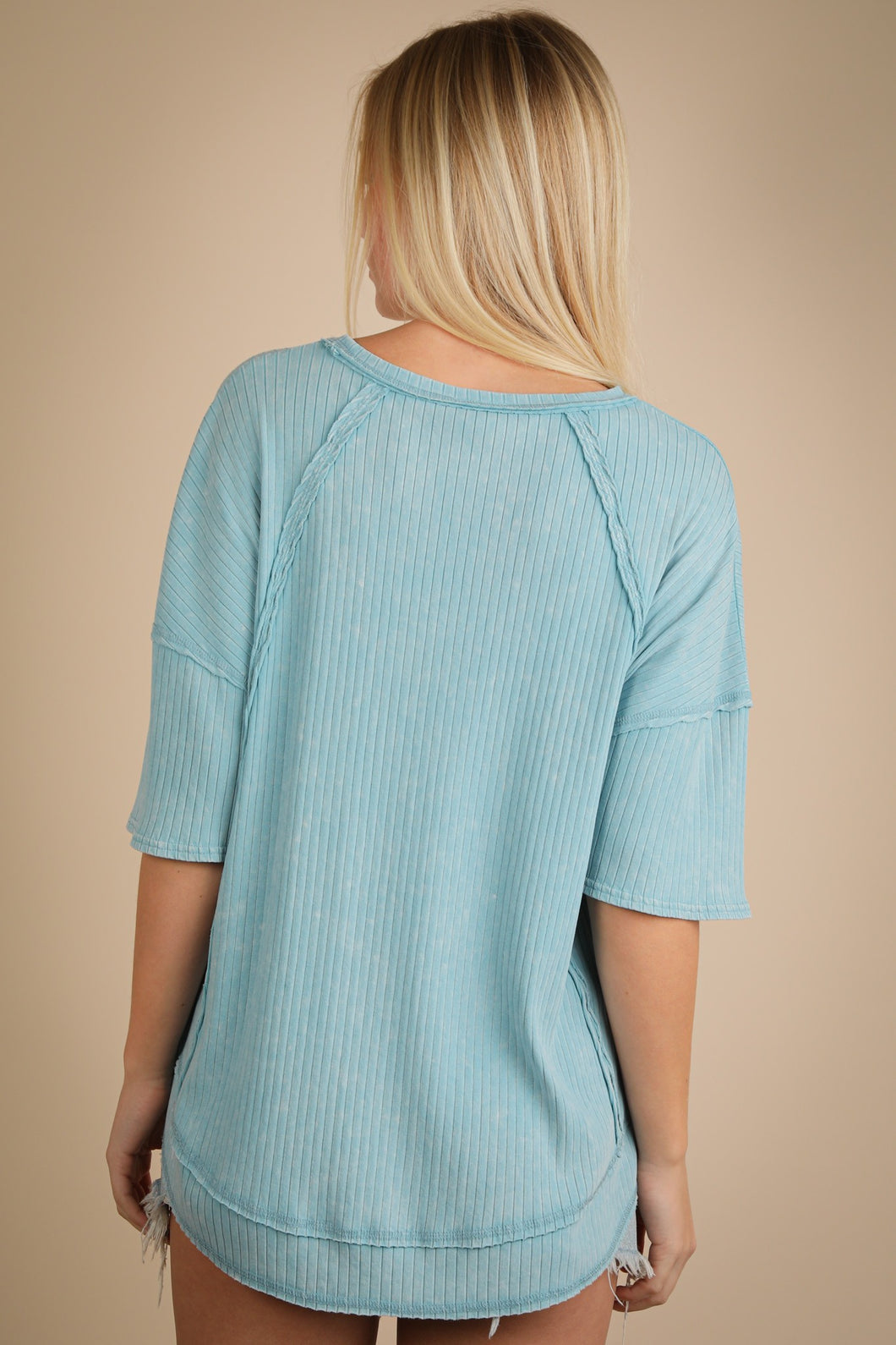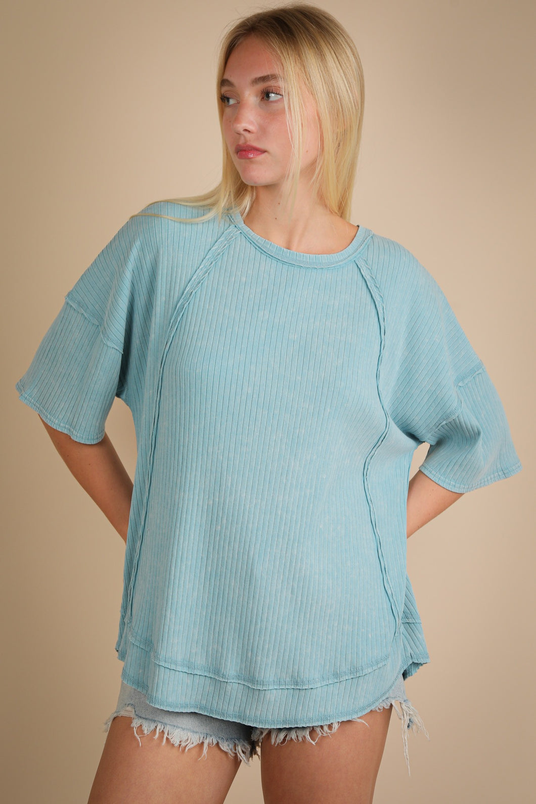 Stay effortlessly cute and comfortable in our Think it Through top. With an oversized ribbed knit design, this mineral washed top features a round neck, short sleeves, and drop shoulders for a relaxed fit. The raw edge detail and double layered round hem add the perfect touch of style to this cozy casual top.