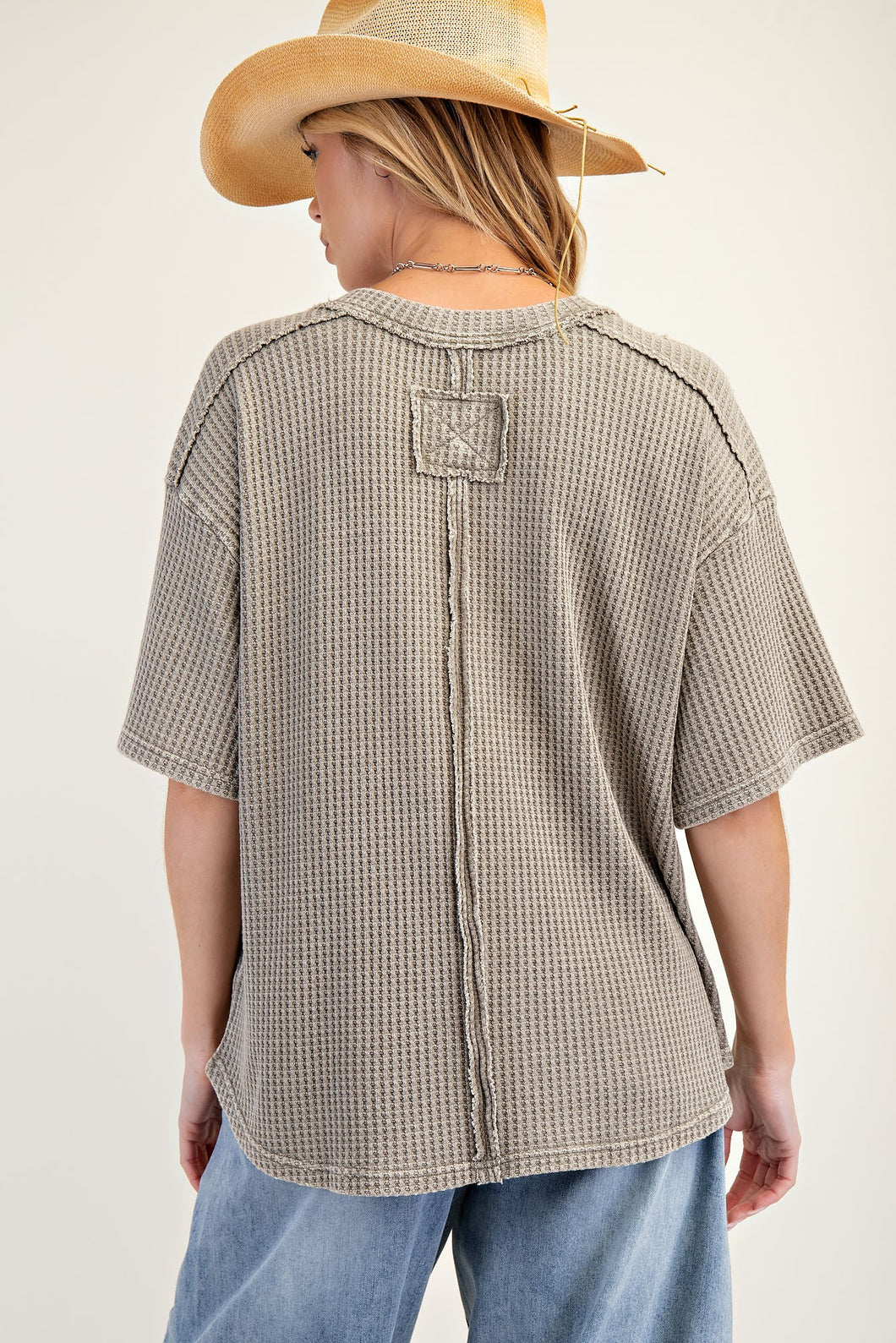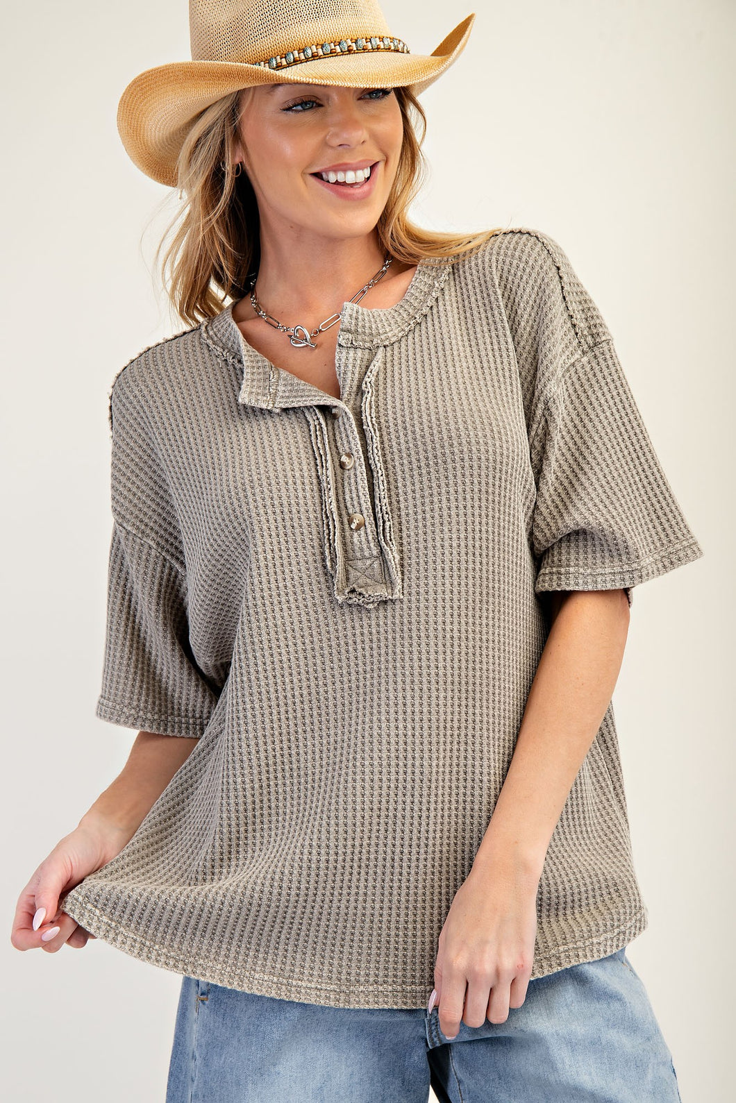 This adorable thermal knit top features a mineral wash for that perfectly lived-in look! With wide short sleeves and dropped shoulders, it offers a relaxed, loose fit that's super comfy. The rounded neckline with button closure adds a sweet touch, while the slight rounded hem and raw cut details with defined seams create a perfectly undone vibe. Your new favorite casual piece!