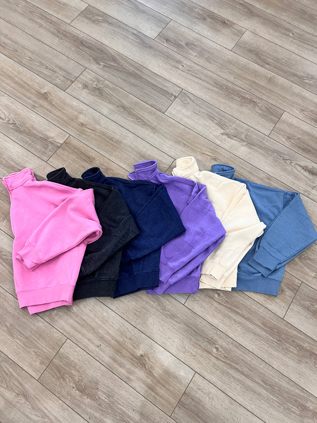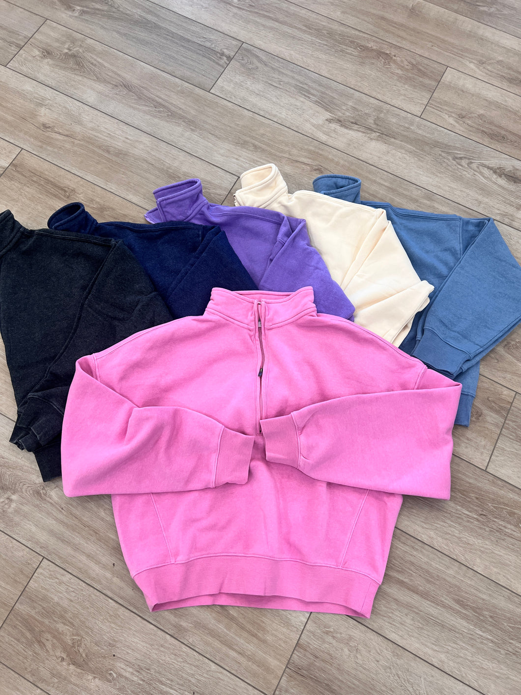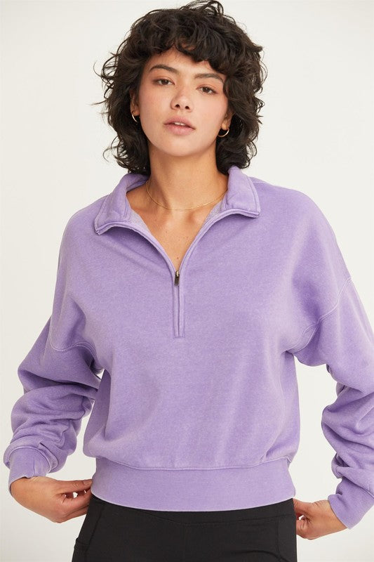 THIS SWEATSHIRT IS DESIGNED WITH A CASUAL-CHIC AESTHETIC, CHARACTERIZED BY A COLLAR, EASY HALF ZIPPER CLOSURE AND LONG SLEEVES WITH DROP SHOULDERS.