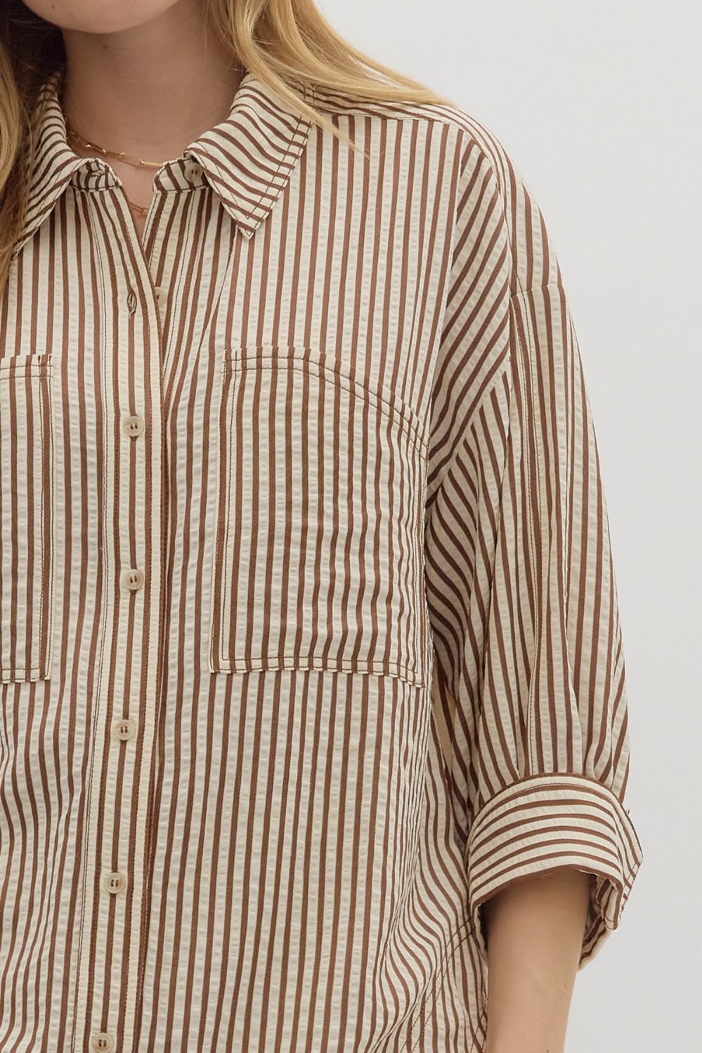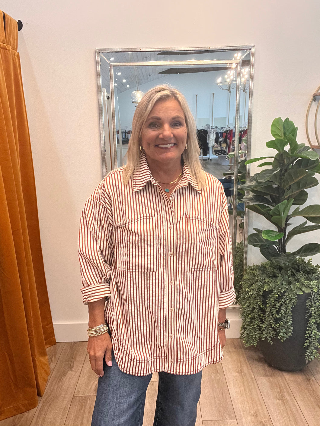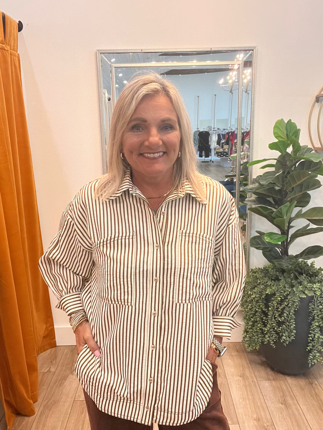 This adorable Weekend Getaway shirt features a charming textured stripe pattern and stylish reverse cuffs on its ¾ sleeves. With double front pockets, it’s perfect for keeping your essentials close while adding a playful touch to your casual look. Cozy and cute for any relaxed outing!